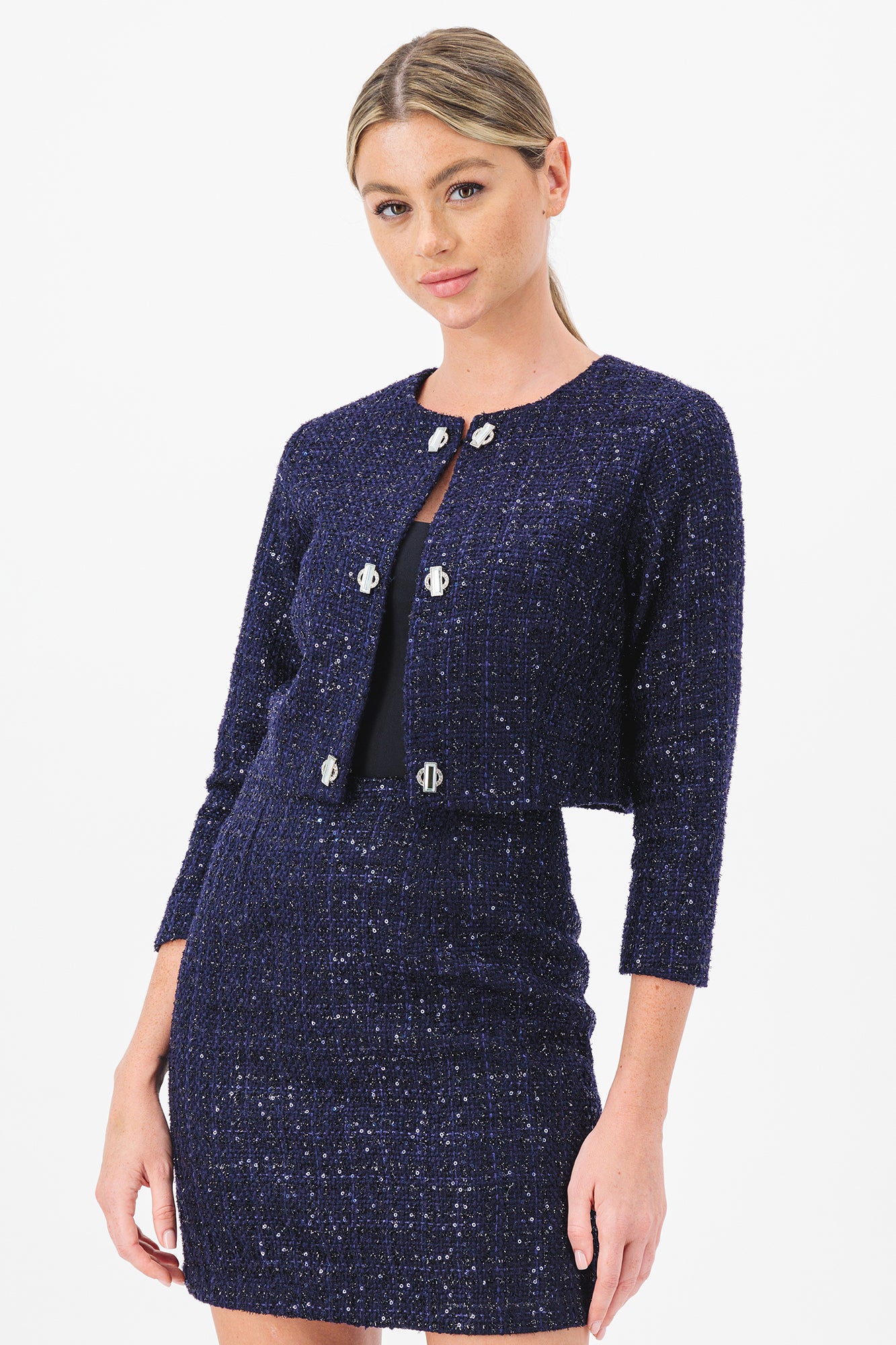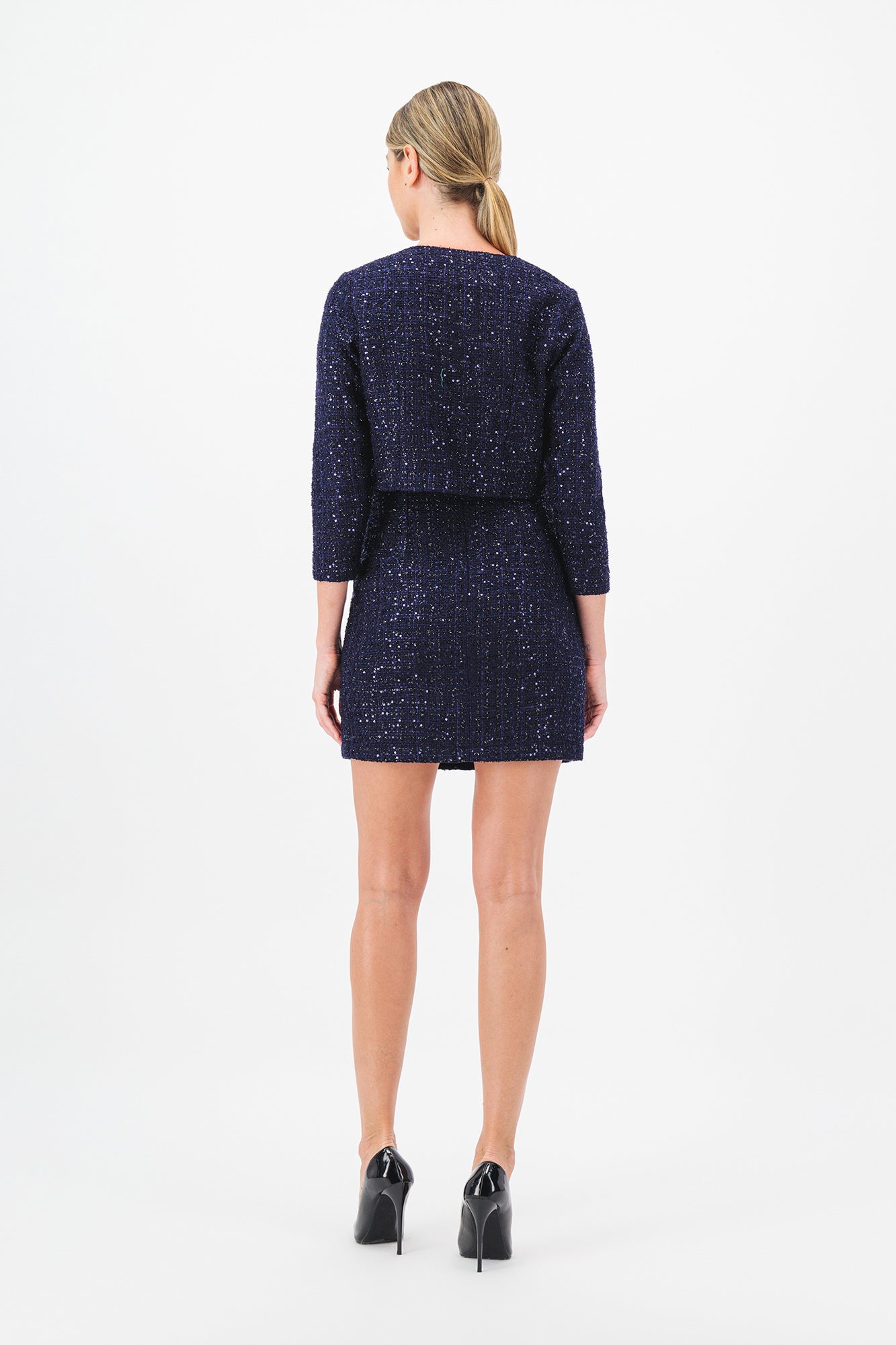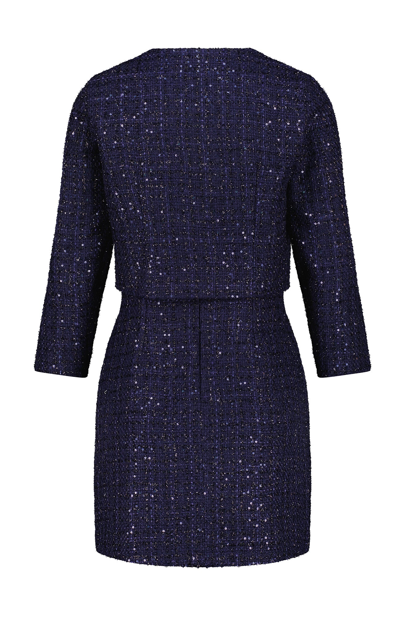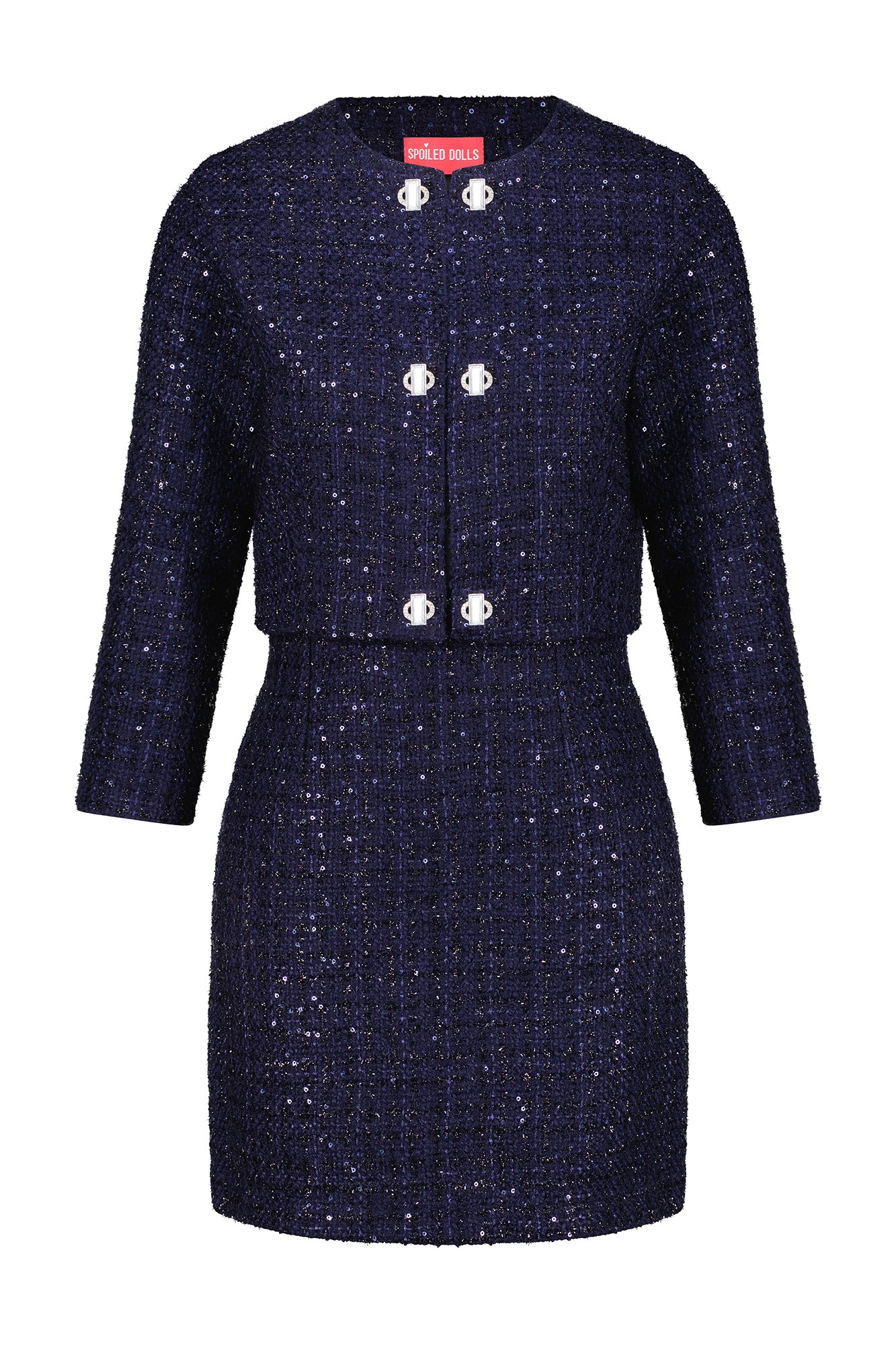 Dark blue sequinned tweed set with rhinestones buttons and blue lining,