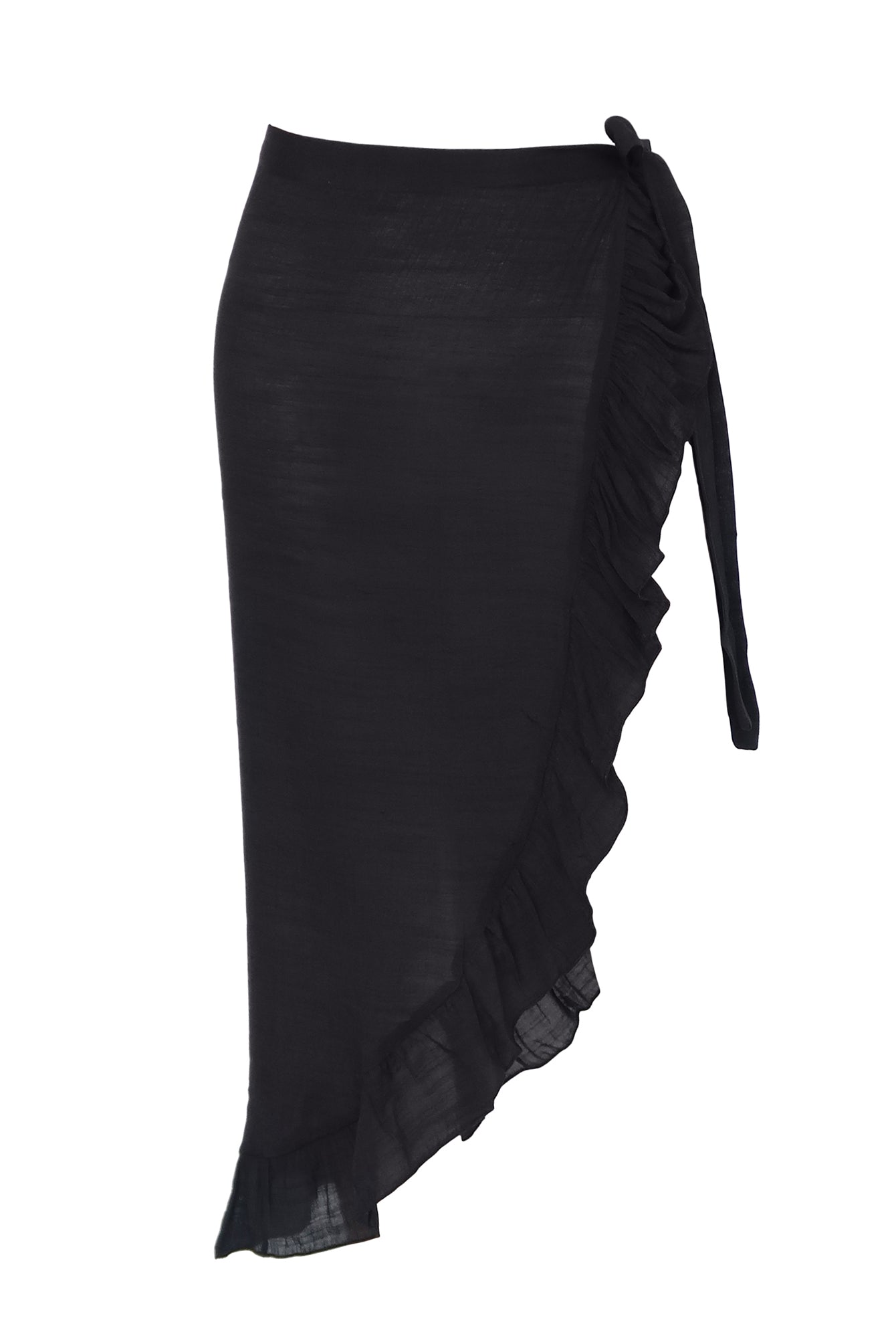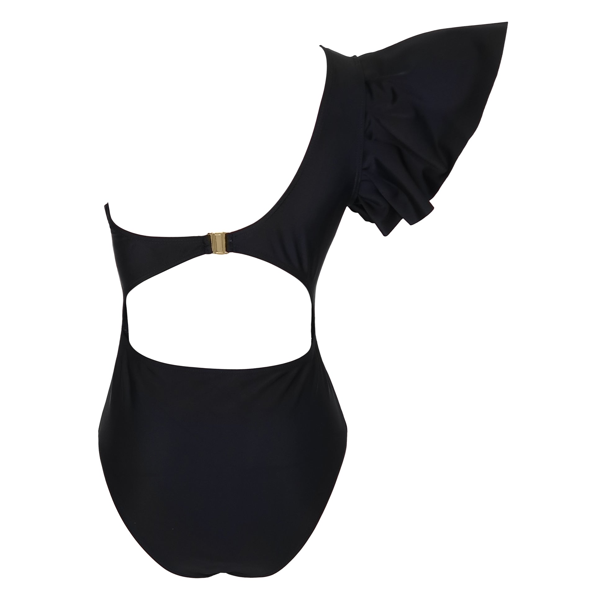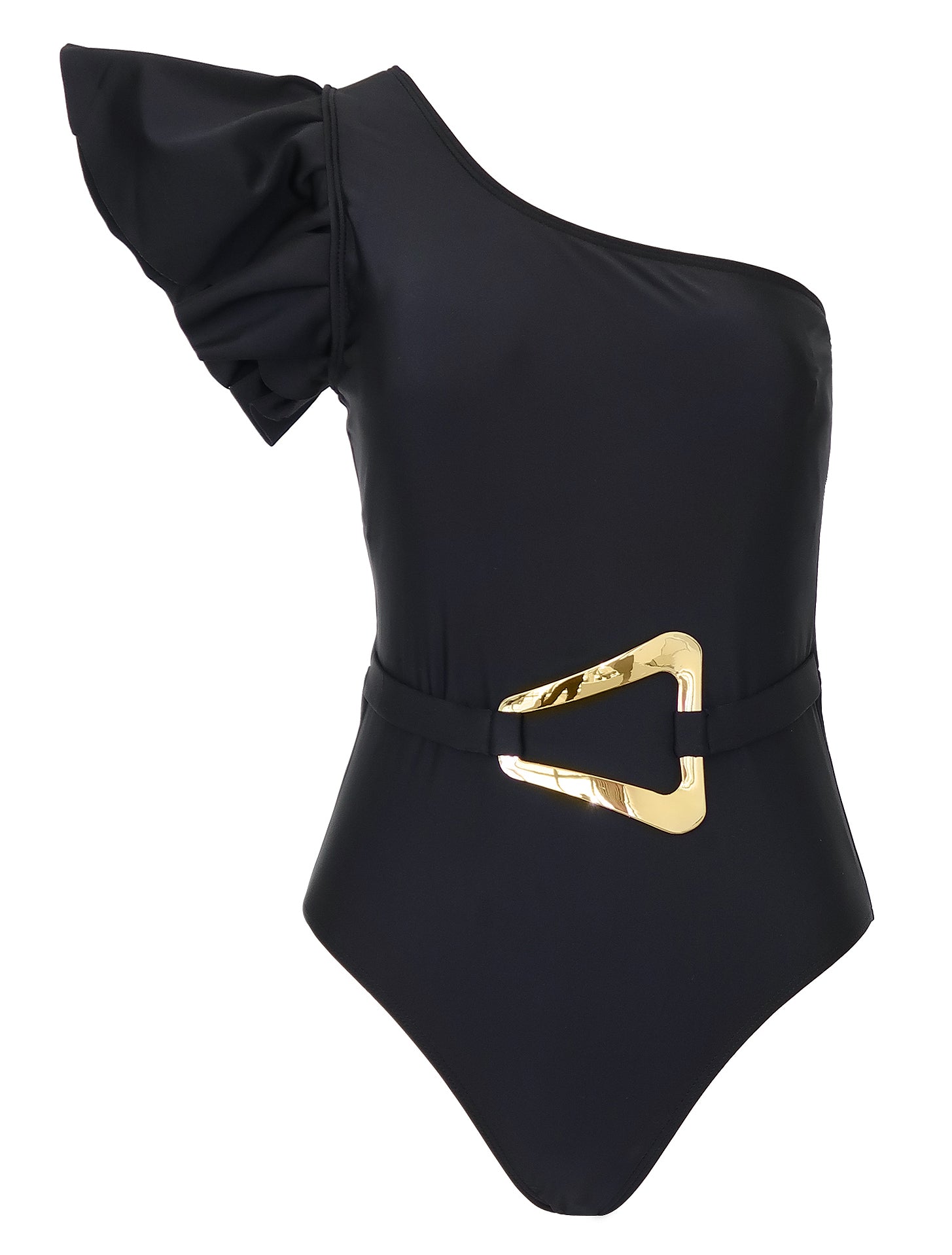 One piece lycra swimwear with gold color buckle and black sarong cover-up